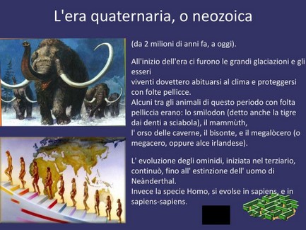 L'ultima era geologica, quella attuale, e' detta quaternaria, o neozoica, cioe' "della vita nuova", poiche' flora e fauna sono costituite da piante e animali tuttora viventi. L'era quaternaria viene divisa in due periodi: Pleistocene e Olocene. Nell'era quaternaria continuano, anche se attenuati, i movimenti delle fasi finali dell'orogenesi alpino-himalayana. Ma cio' che soprattutto caratterizza quest'era e' l'alternarsi di periodi freddi e di periodi caldi, che causarono l'avvicendarsi di grandi glaciazioni (con estensione delle calotte polari a latitudini piu' basse) e di periodi interglaciali (periodi in cui si riduce l'estensione dei ghiacciai). Per l'area alpina, sono state individuate cinque grandi glaciazioni, (dette Donau, Gunz, Mindel, Riss e Wurm, dalla piu' antica alla piu' recente), intervallate da quattro periodi interglaciali. Il ritiro dei ghiacciai non fu regolare e continuo, ma caratterizzato da soste e limitati avanzamenti. L'espansione e la contrazione delle calotte glaciali provoco' variazioni di livello dei mari: durante le glaciazioni il livello marino si abbassa sensibilmente (regressioni marine), a causa delle enormi quantita' d'acqua ammassate sui continenti sotto forma di ghiaccio; al contrario, durante i periodi interglaciali la fusione dei ghiacciai provoca l'innalzamento del livello dei mari (trasgressioni marine). L'alternarsi delle glaciazioni e dei periodi interglaciali ha avuto grande influenza anche sulla distribuzione degli esseri viventi sul pianeta: in particolare, alle nostre latitudini si sono succedute specie proprie di climi tropicali a specie tipiche di zone a clima piu' freddo. Tra gli eventi biologici che hanno caratterizzato l'era quaternaria si deve segnalare soprattutto la "rapida" evoluzione e diffusione sul pianeta del genere Homo.