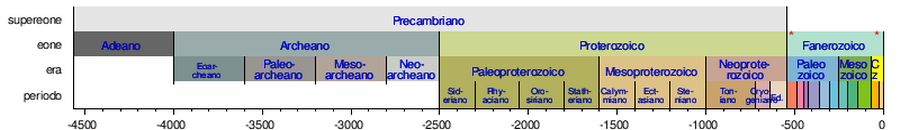 Lo studio delle rocce e dei fossili ha permesso di individuare e di ordinare i fenomeni geologici e gli eventi biologici che hanno caratterizzato la storia della Terra, dalla sua origine fino a oggi, e di suddividere i 4,6 miliardi di anni della Terra in lunghi intervalli di tempo, ciascuno dei quali e' stato caratterizzato da particolari eventi. Piu' precisamente, la storia della Terra e' stata suddivisa nelle seguenti categorie temporali, dalla piu' ampia alla piu' ristretta: era, periodo, epoca ed eta'. Le ere, i periodi e le epoche hanno nomi applicabili su scala mondiale; per le eta', invece, esistono nomi differenti a seconda delle regioni. La storia del nostro pianeta e' stata suddivisa in cinque ere: l'era precambriana (o criptozoica), l'era primaria (o paleozoica), l'era secondaria (o mesozoica), l'era terziaria (o cenozoica) e l'era quaternaria (o neozoica), dalla piu' antica alla piu' recente, che a loro volta sono state suddivise in diversi periodi.