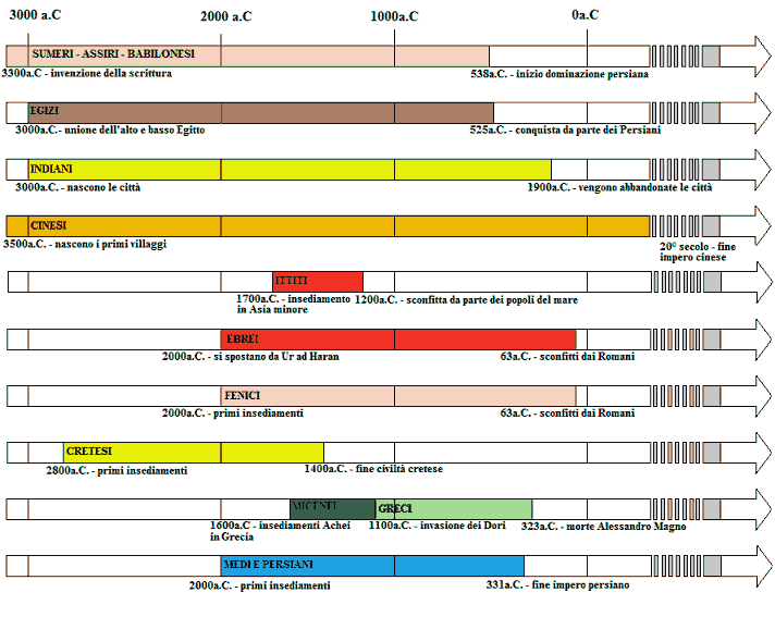 La storia antica si occupa dello studio delle prime civilta' che adottarono un sistema grafico di scrittura: le popolazioni del Vicino Oriente, come Sumeri, Assiri, Babilonesi; quelle dell’Africa settentrionale, come gli Egizi; e le europee, le principali sono le civilta' greche e romane, fondamento della cultura dell’Occidente. Il cosiddetto 'evo antico' inizia nel IV millennio, con la comparsa dei primi sistemi di scrittura in Mesopotamia, e si conclude con la caduta dell’Impero romano d'Occidente nel 476 d.C..